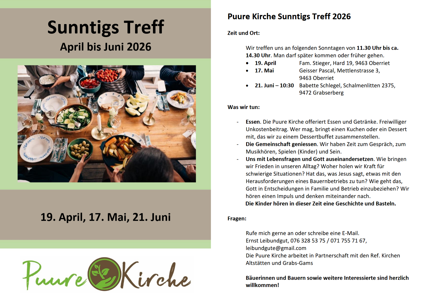 - Essen. Die Puure Kirche offeriert Essen und Getränke. Freiwilliger Unkostenbeitrag. Wer mag, bringt einen Kuchen oder ein Dessert mit, das wir zu einem Dessertbuffet zusammenstellen.